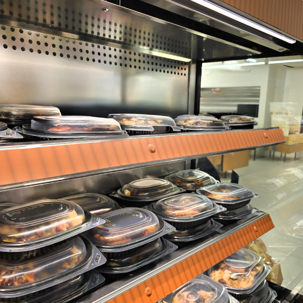 Les vitrines verticales compactes Futuro 2 sont également disponibles en version chauffée, adaptées à la vente de produits chauds emballés, d'articles à emporter et de plats prêts à manger tels que des rôtis, des lasagnes, des nouilles, des soupes, etc.