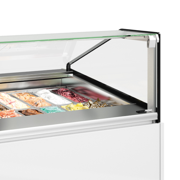 Versão especialista para exposição e serviço de gelado com ventilação suave para uma uniforme distribuição da temperatura por todo o expositor, assegurando a correta conservação dos gelados até 8 cm acima da cuvete.